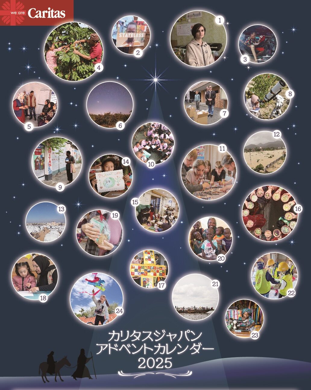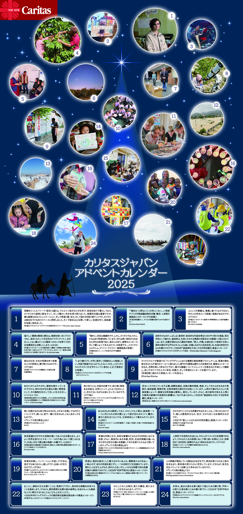 We are Caritas31号は、クリスマス特集号です。内面には、本年度のカリタスジャパンの支援に関連する写真を12月1日から24日までのアドベントカレンダー形式で縦型に配置しています。写真の下には、支援先の皆さんの声、回勅『ラウダート・シ』(LS)、『兄弟の皆さん』(FT)、教皇メッセージなどの言葉*や、カリタス活動を実践する人々の姿や話を掲載しています。